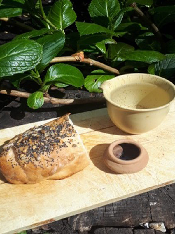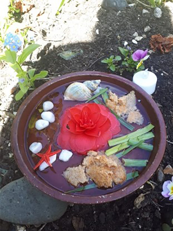 Fill your little pond with anything you find, stones, shells, grass, petals, anything at all… Say thank you to God for the joy of His life giving water.